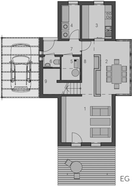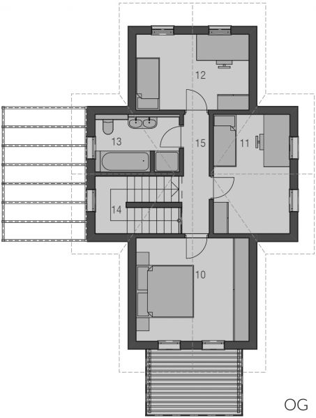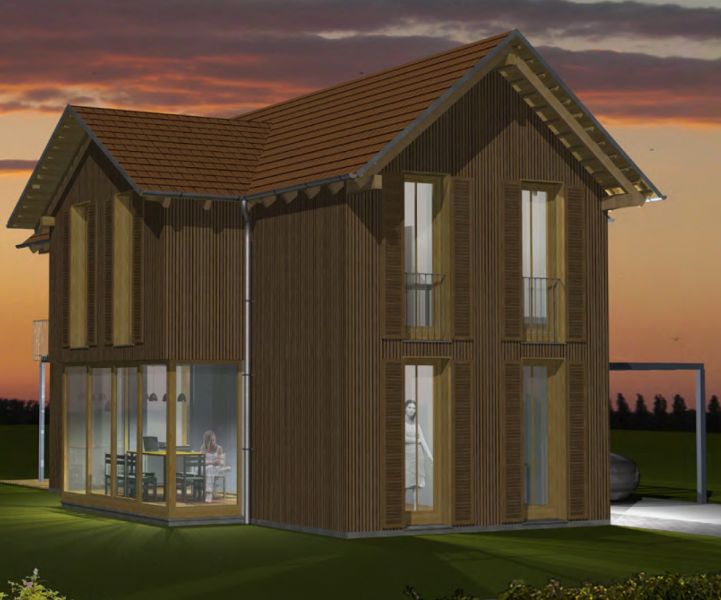 Der Haustyp "Wellental" besitzt durchgehend volle Raumhöhen im Obergeschoss und ein gekreuztes Satteldach. Die Raum- und Blickbezüge sind innen wie außen differenziert und spannungsvoll. Dies wird unter anderem durch die fein durchdachte Erschließung erzielt, die im Verhältnis zu den Wohnflächen nur wenig Raum beansprucht. Neben viel Platz für Küche, Ess- und Wohnzimmer im Erdgeschoss finden sich im Obergeschoss Elternschlafzimmer, zwei Kinderzimmer und Bad.
