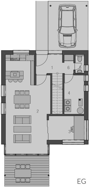 Beim Haustyp "Bernstein" besticht nicht nur die besondere Form mit vesetztem Baukörper und Gegengiebel – die ausgefeilte innere Aufteilung hat auch für größere Familien einiges zu bieten. Neben dem komfortablen Eingangsbereich mit Funktions- und Stauräumen ist vor allem der großzügig offene Wohn- Essraum mit seinem geschützten Terrassenbereich charakteristisch für das Erdgeschoss. Das Obergeschoss bietet mit Ankleide und Bad nicht nur viel Komfort für die Eltern sondern auch drei Zimmer und ein eigenes Bad für die Kinder.