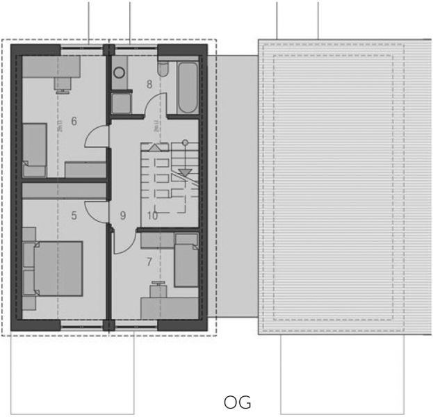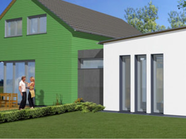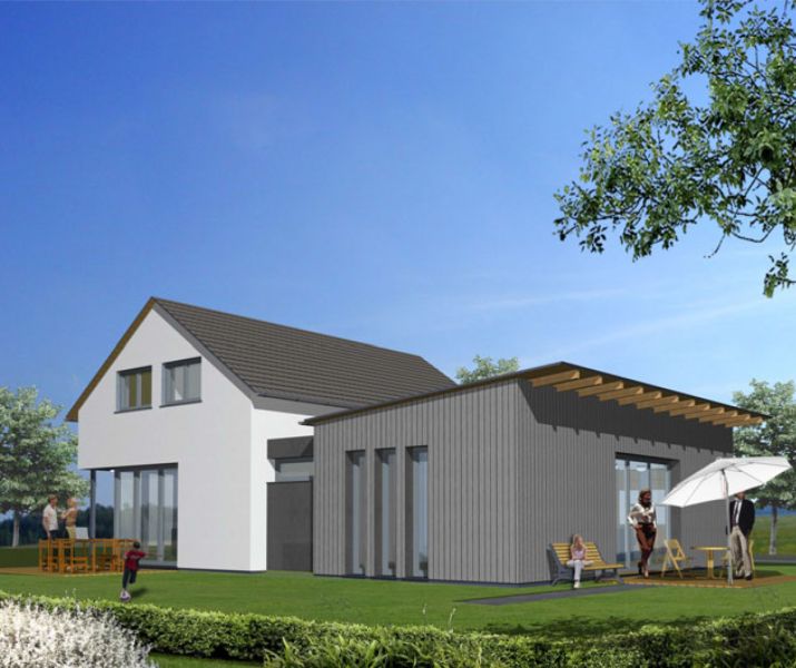 Gemeinsam Leben - getrennt Wohnen. Durch die Bündelung der notwendigen technischen Anlagen und Nebenräume ergibt sich eine effiziente Bauweise. Durch die bauliche Trennung beider Lebensräume wird ein hohes Maß an Eigenständigkeit und Privatheit trotz sozialer Nähe geschaffen. Dies findet sich auch in der Formensprache des Baukörpers des Haustyps "Meerwasser" wieder.
