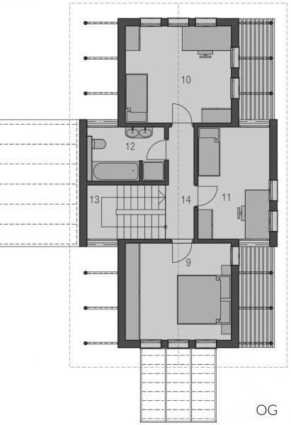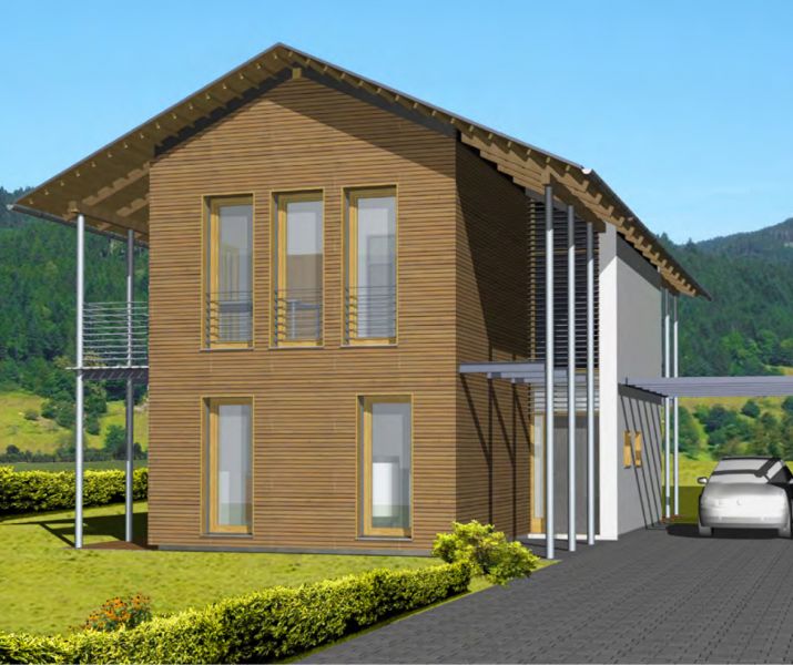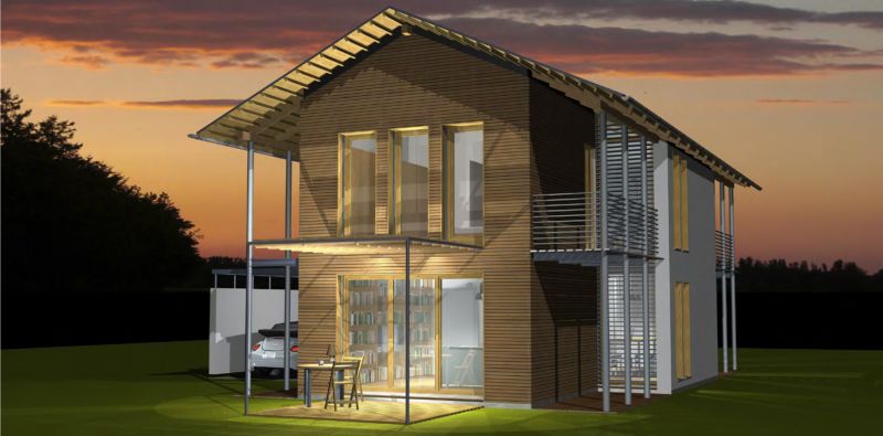 Der Haustyp "Muschelgold" besitzt durchgehend volle Raumhöhen im Obergeschoss und ein weit ausladendes Dach. Die Raum- und Blickbezüge sind innen wie außen differenziert und spannungsvoll. Dies wird unter anderem durch die fein durchdachte Erschließung erzielt, die im Verhältnis zu den Wohnflächen nur wenig Raum beansprucht. Neben viel Platz für Küche, Ess- und Wohnzimmer im Erdgeschoss finden sich im Obergeschoss Elternschlafzimmer, zwei Kinderzimmer und Bad.