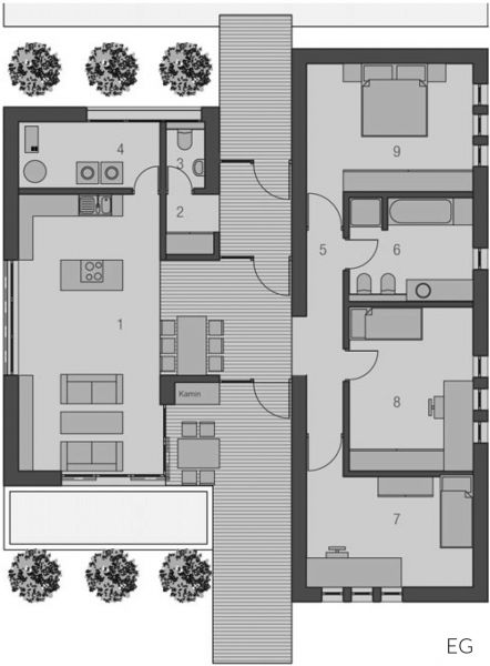 Erleben Sie die Vorteile dieses zweiteiligen Grundrisses: Das gemütliche Beisammensein der Familie im Ess- und Wohnbereich und die Ruhe in den eigenen Zimmern. Mit seinen optimalen Verkehrsflächen wirkt das Haus "Sommerbrise" großzügig. Zusätzlich sorgt die integrierte Terrasse für einen Raumfluss zwischen Innen und Aussen. Man holt sich sozusagen die Natur ins Haus. Es ist eine Freude in diesem Haus zu leben und alt zu werden.