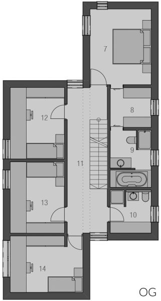 Beim Haustyp "Bernstein" besticht nicht nur die besondere Form mit vesetztem Baukörper und Gegengiebel – die ausgefeilte innere Aufteilung hat auch für größere Familien einiges zu bieten. Neben dem komfortablen Eingangsbereich mit Funktions- und Stauräumen ist vor allem der großzügig offene Wohn- Essraum mit seinem geschützten Terrassenbereich charakteristisch für das Erdgeschoss. Das Obergeschoss bietet mit Ankleide und Bad nicht nur viel Komfort für die Eltern sondern auch drei Zimmer und ein eigenes Bad für die Kinder.