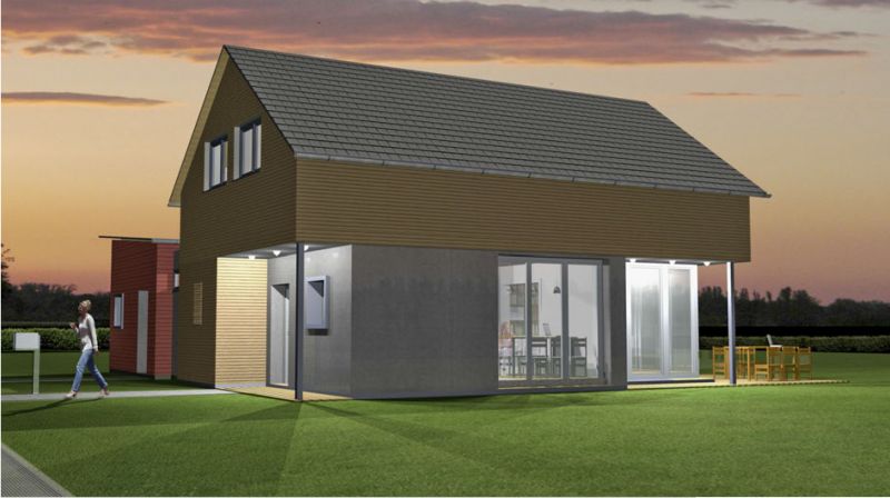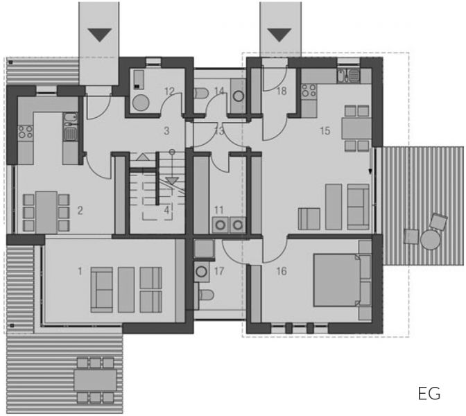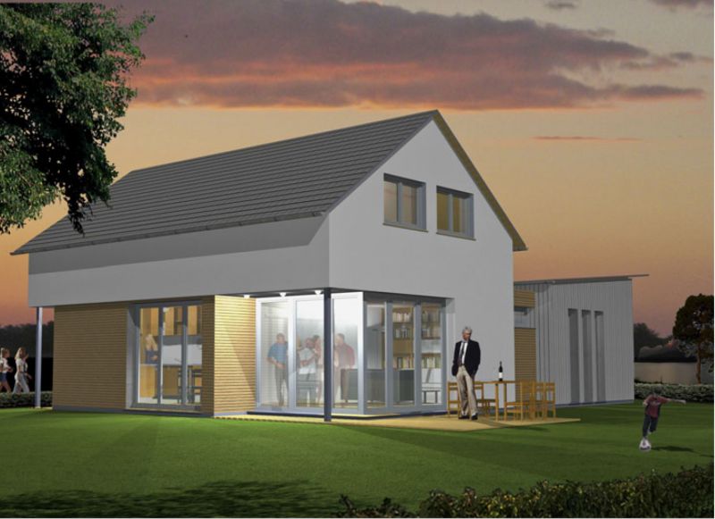 Gemeinsam Leben - getrennt Wohnen. Durch die Bündelung der notwendigen technischen Anlagen und Nebenräume ergibt sich eine effiziente Bauweise. Durch die bauliche Trennung beider Lebensräume wird ein hohes Maß an Eigenständigkeit und Privatheit trotz sozialer Nähe geschaffen. Dies findet sich auch in der Formensprache des Baukörpers des Haustyps "Meerwasser" wieder.