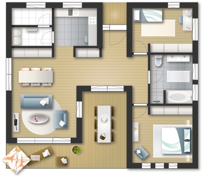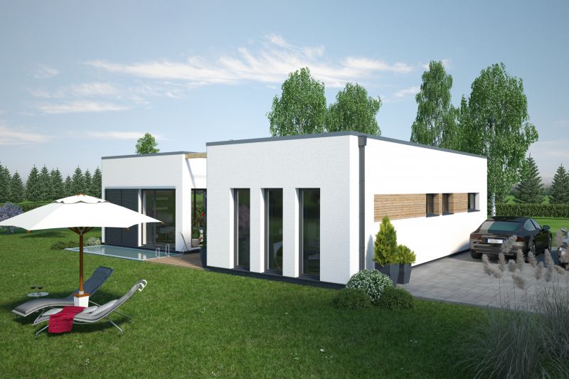 Der Haustyp "Leuchtfeuer" verbindet die Ideen modernen Wohnens mit den Vorzügen eines eigenständigen Eigenheims auf einer Ebene. Unter Verzicht auf ein Obergeschoss bietet dieser Haustyp trotzdem besonders vielschichtige und interessante Raumbezüge – privatere Bereiche und Wohnbereich werden konsequent getrennt. Eine mittlere Achse bildet neben einem geschützten Eingangsbereich einen besonders qualitätvollen geborgenen Freisitz, dem Wohnzimmer zugeordnet. So verwirklichen Sie als Single oder auch als Paar den Traum vom modernen Wohnen.