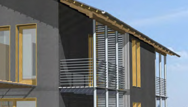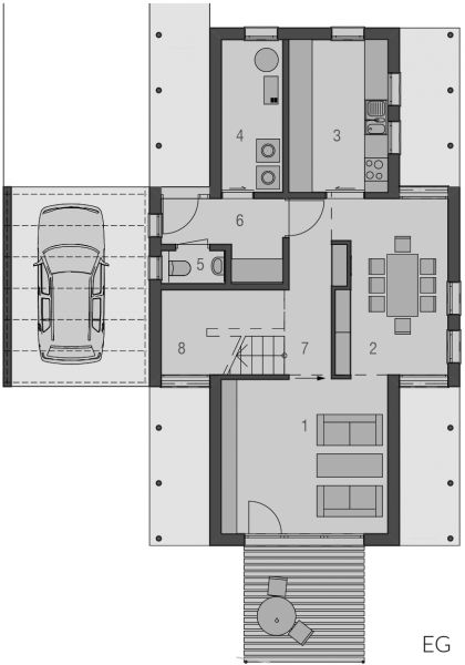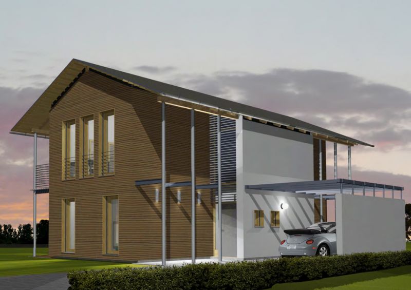 Der Haustyp "Muschelgold" besitzt durchgehend volle Raumhöhen im Obergeschoss und ein weit ausladendes Dach. Die Raum- und Blickbezüge sind innen wie außen differenziert und spannungsvoll. Dies wird unter anderem durch die fein durchdachte Erschließung erzielt, die im Verhältnis zu den Wohnflächen nur wenig Raum beansprucht. Neben viel Platz für Küche, Ess- und Wohnzimmer im Erdgeschoss finden sich im Obergeschoss Elternschlafzimmer, zwei Kinderzimmer und Bad.