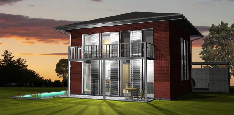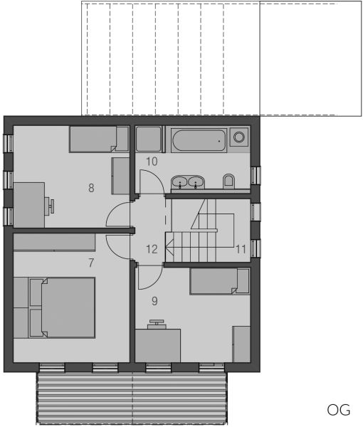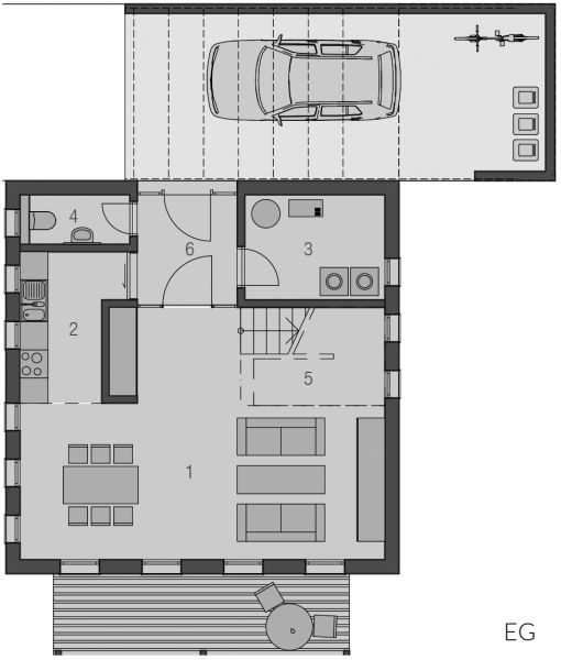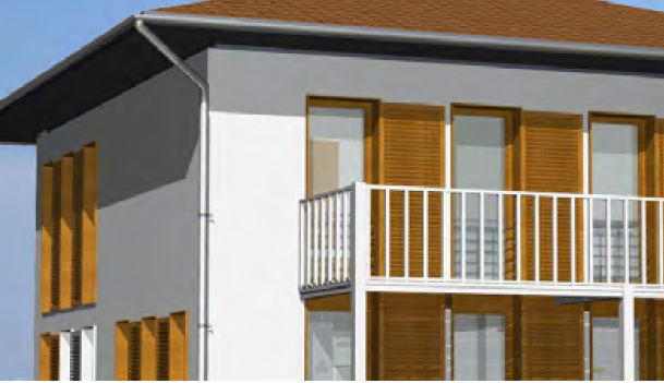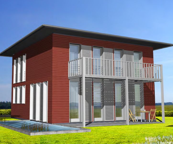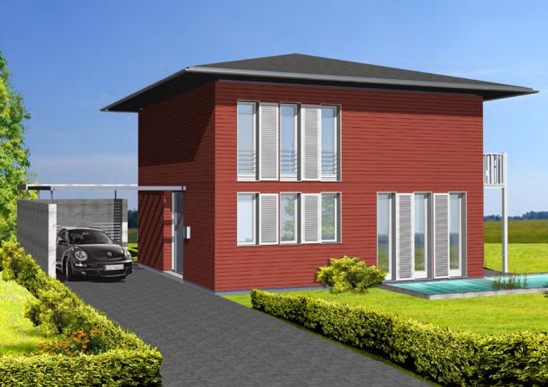 Der Haustyp "Windstrom" zeichnet sich außen als klassischer Villentypus mit großem Dachüberstand und langgestreckten Fensterformaten aus, innen durch viel Raum und Licht auf kompakter Fläche. Ein offener Grundriss minimiert die Verkehrsflächen und schafft großzügige Raumsituationen, wie das zum Wohnzimmer offene, großzügig verglaste Treppenhaus. Die Ergänzung durch Terrasse und Balkon auf der dem Eingang abgewandten Seite ergänzt Baukörper und Funktion besonders reizvoll. Im Obergeschoss ist bei durchgehend voller Raumhöhe Platz für Eltern, Bad sowie zwei Kinderzimmer.